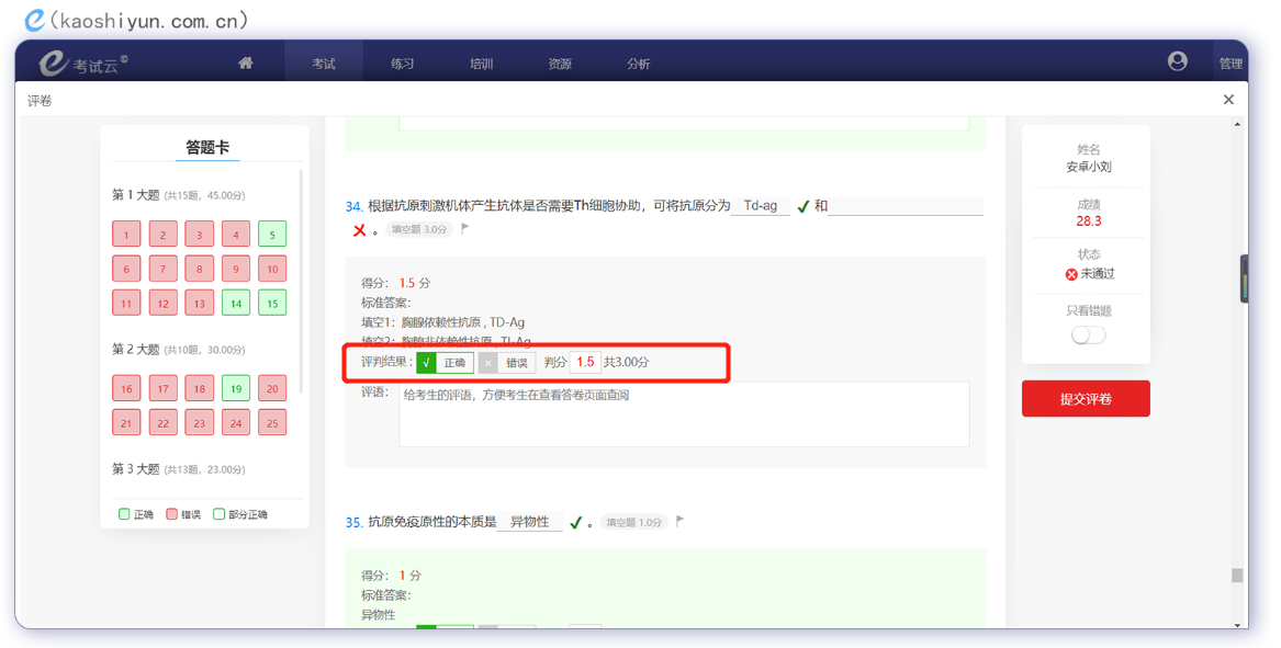 在人工阅卷的时候,如果阅卷人觉得系统的判分与考生应得分数不符,可以修改考生该题的得分,还可以在试题下方添加评语。
