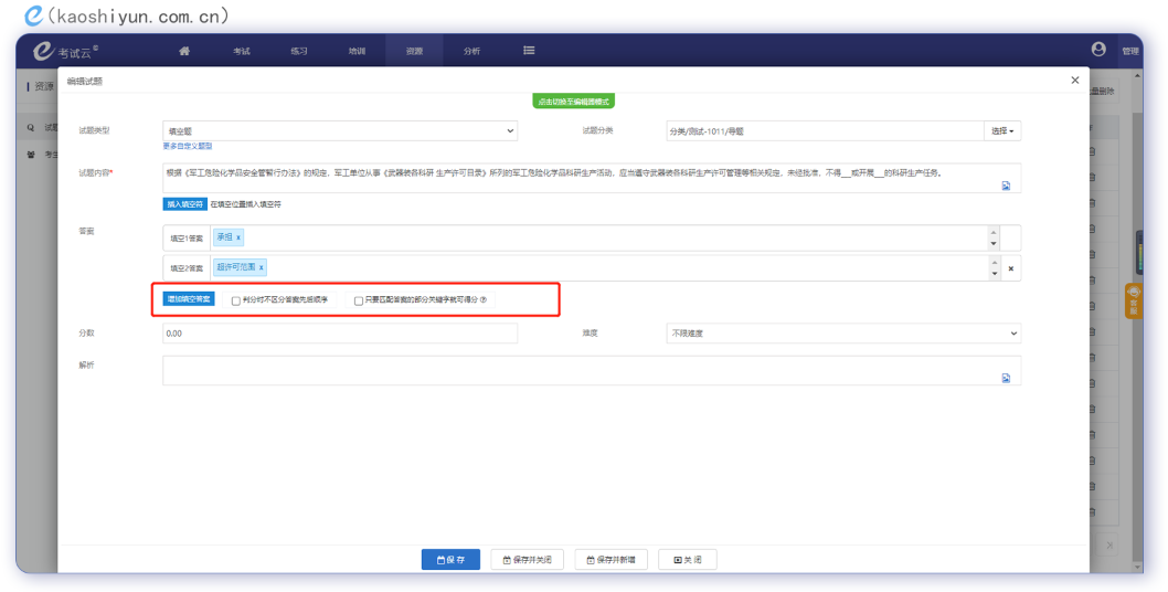 3、像填空题这类题型的试题,尤其是有多个填空答案的时候,无法灵活的判分。考试云支持“判分时不区分答案先后顺序”和“只有匹配答案的部分关键词即可得分”的设置,这样面对不同内容的填空题,系统可以更加灵活阅卷,判分也能更加准确。