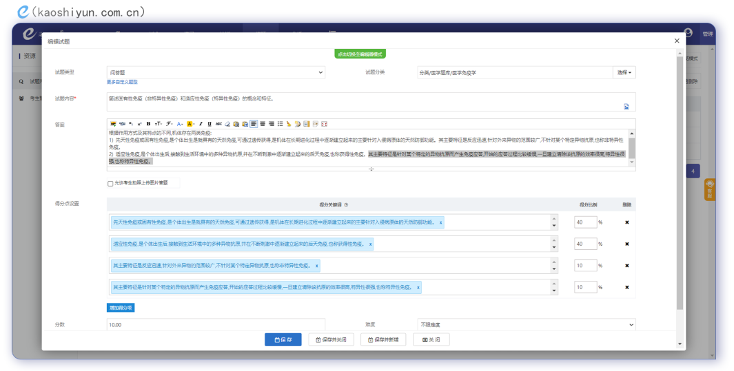 4、对于问答题、分析题这种主观性比较强的题型,可以设置得分点来进行阅卷,每个得分点都可以设置得分比例,如果是重要的得分点,我们在设置得分比例的时候可以将比例设置的大一点,得分点设置的越详细,判分就会越准确。