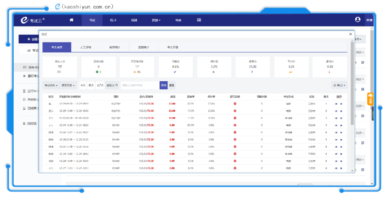 任何一场考试,人们最关注的就是考试的分数、排名。考试云在考试结束后,会进行自动阅卷,并将每个考生的考试分数、排名、正确率、得分率、平均分等进行统计分析。如果需要以文档的形式进行存档,还可以以文档的形式导出考试成绩。