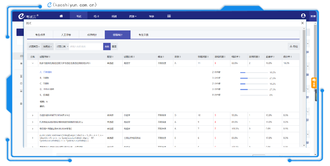 每一次考试都是为了检验知识点的学习情况,考试云将考试的题型、每道题的答题次数、答错次数、错误率、答对次数、正确率,得分率等数据汇总展示。还可以查看考生对试题每个选项的答题详情,这样可以方便老师了解学生每个知识点的掌握程度,可以将答错率高的试题或者选项进行着重的讲解。