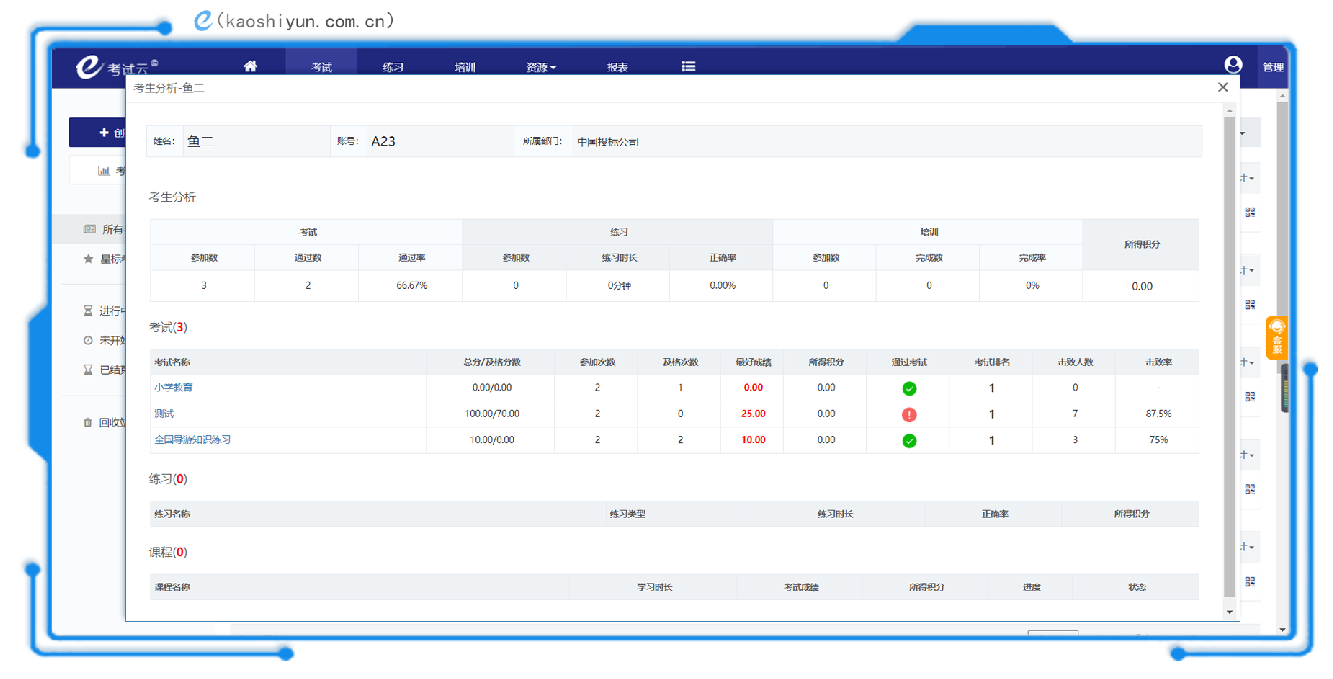 系统把考生参加过的考试情况汇总,可以直接看到考生参加过的所有考试的详情,如成绩、排名等数据。通过对参考人员数据的分析,更有利于老师了解每个学生的学习情况。