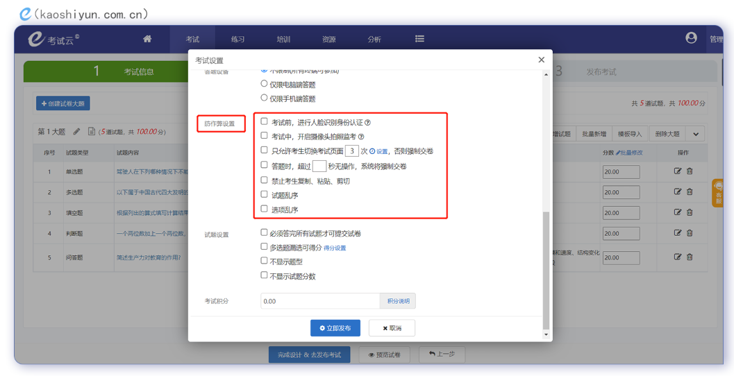 3、设置考试规则,发布考试。