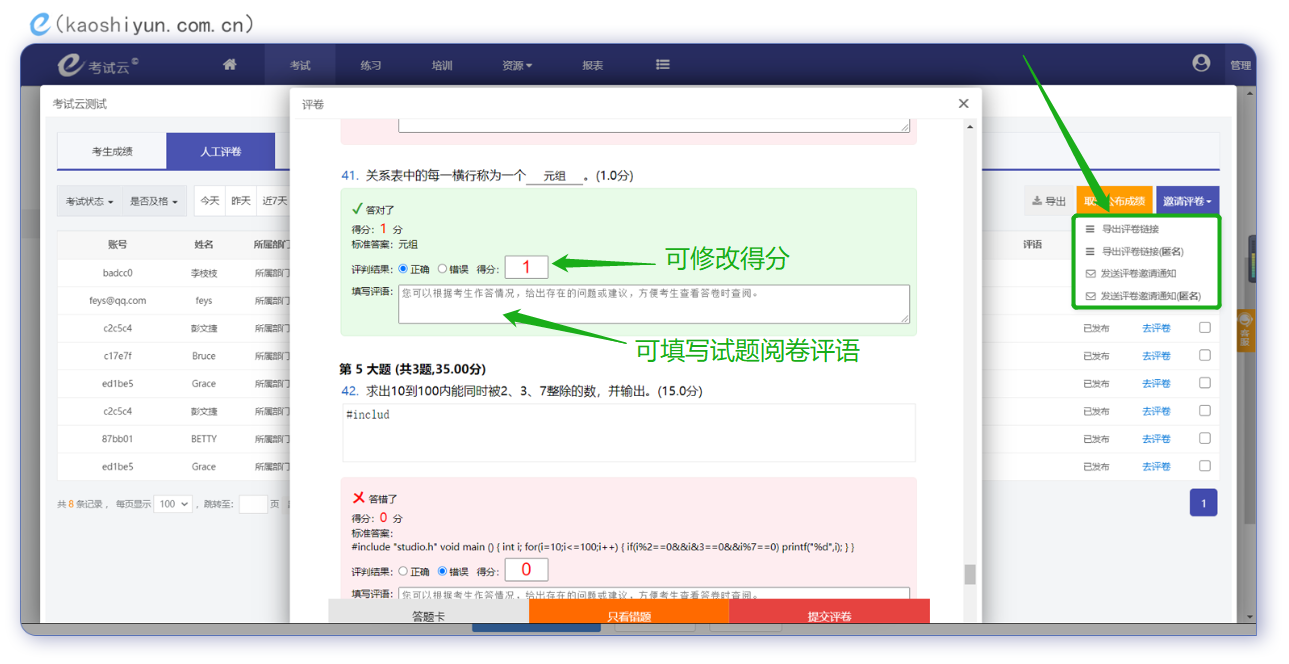 2、手工阅卷:考试云在线答题系统不仅可以管理员在后台进行人工阅卷,还可以导出评卷链接邀请他人协助阅卷,在阅卷时,可以修改系统判卷的结果和得分,填空题和问答题还可以对每一道试题填写评卷评语。