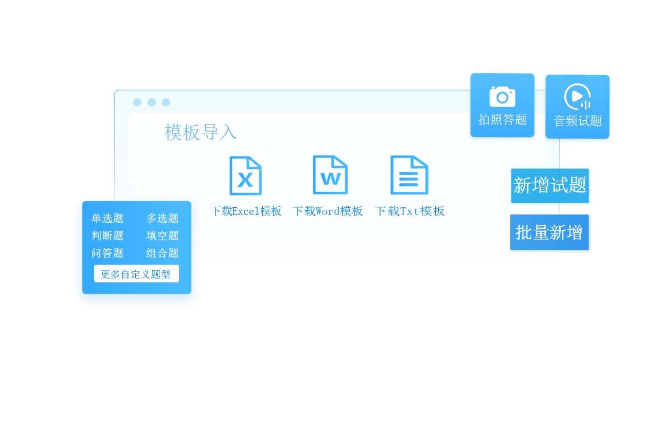 考试云支持的试题题型多样,各科目的试题题型都可以满足;有单个新增、批量新增、模板导入(Excel、Word、TXT)等添加试题的方式,还能对题库试题进行批量修改、删除及导出试题。