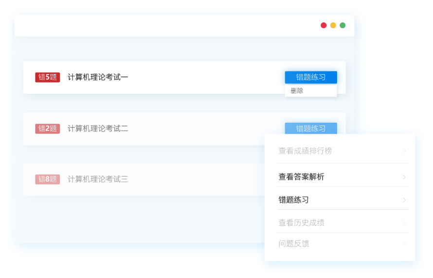 章节练习和模拟练习中做错的试题在线答题系统会自动记录,并生成错题本。结束练习后,能直接进行错题练习,也可以登录考生中心,在错题本中进行对应的错题练习。错题练习没有次数限制,可以反复练习,加强对错题知识点的记忆和掌握。