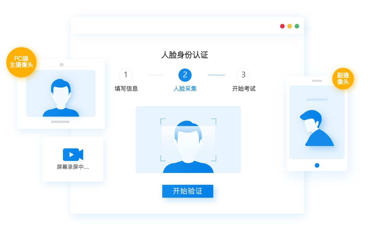 ②、本地人脸验证:考生进入考试前,需要先输入正确的参考账号并核对账号人脸信息是否正确,再拍摄活体人脸照片,系统会将摄像头采集的活体人脸与本地人脸库进行比对,验证成功才能进入考试,能够确保考生身份真实有效。
