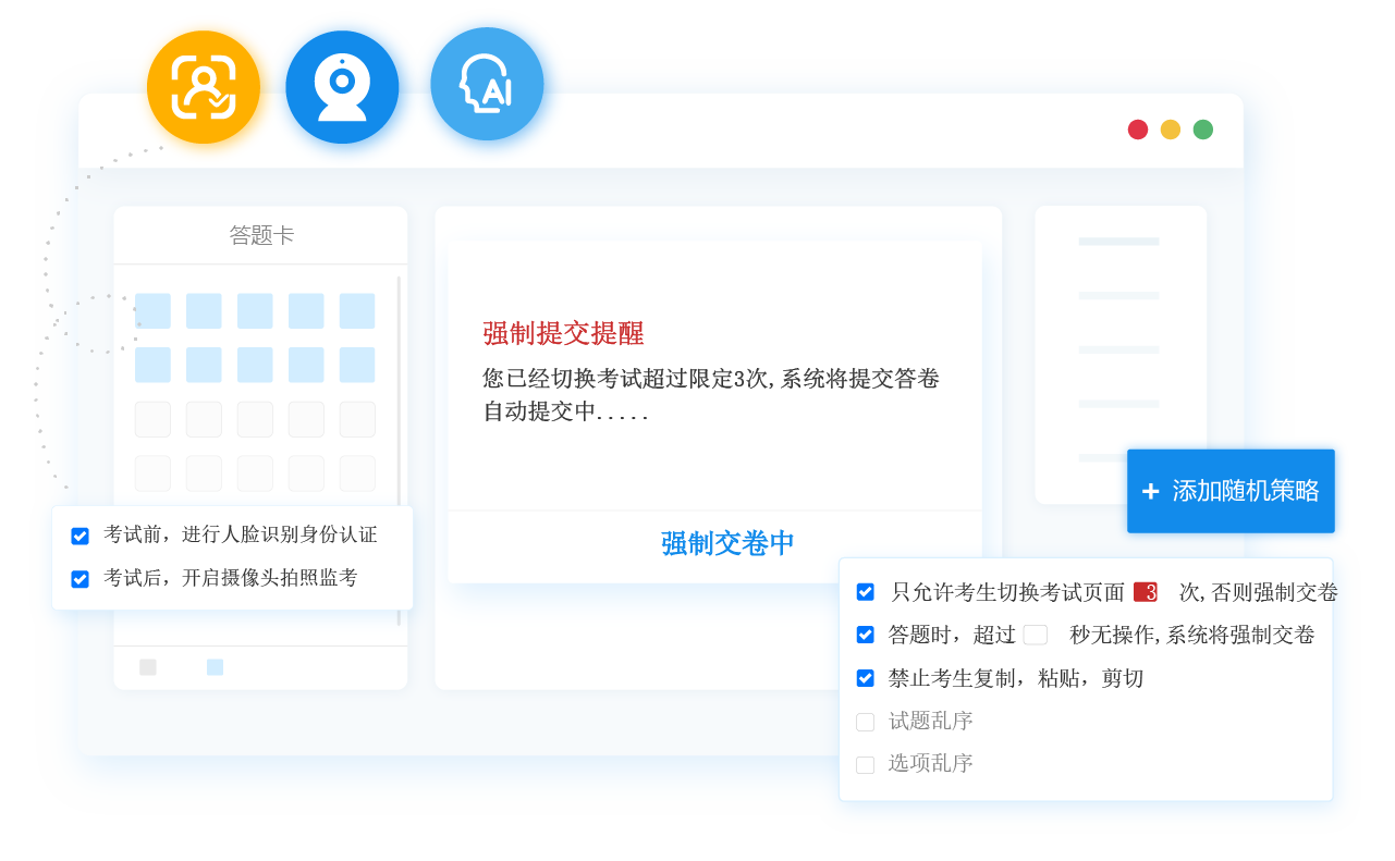除了三路音视频实时监考,在考试的过程中,考试云还有一些限制答题违规操作的措施,以此更好地协助系统进行实时监考,便于更加严格的管理考试作答过程,保证考试的公平公正。