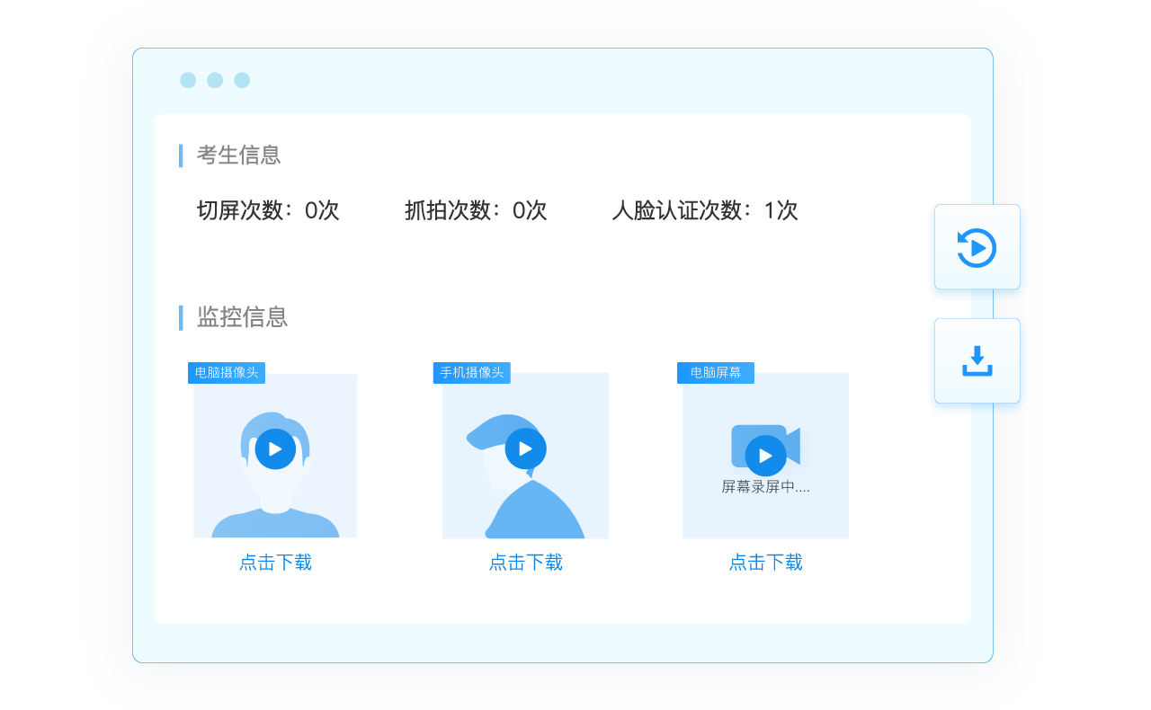 在考生提交试卷结束考试后,监考老师可以在后台查看考生切换屏幕的次数,还可以回看三路音视频的监考视频。对于考试纪律非常严肃的考试,还支持导出监考视频进行备份存档。