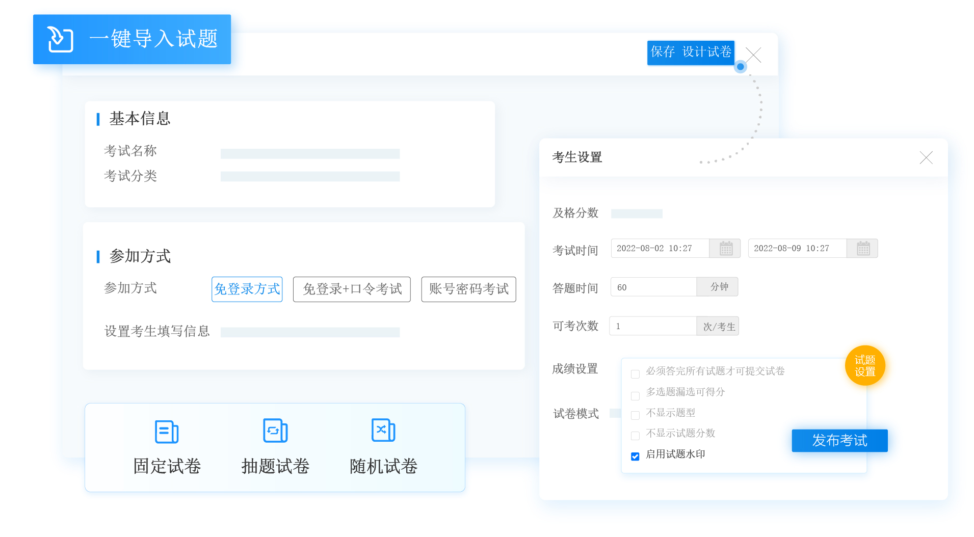 设计完试卷后,设置考试时间、及格分数、答题时间、可考次数、试卷模式、防作弊等考试的基础配置,发布考试,通知学生。