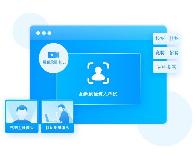 在整个考试答题过程中,通过电脑摄像头正面监控、手机摄像头侧方位监控以及学生答题屏幕实时共享监控三个通道来进行监考,监考的视频也将同步录制,考试结束后可进行回看、下载;