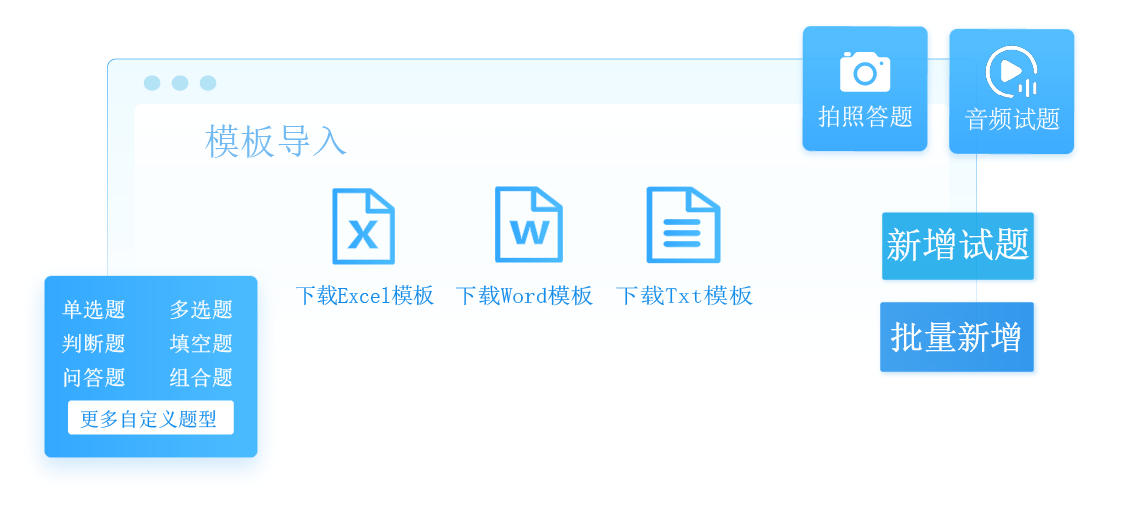 考试云有Excel、Word、Txt模板一键导入试题,还有自带的编辑器能够可视化的单个新增试题或批量新增试题。