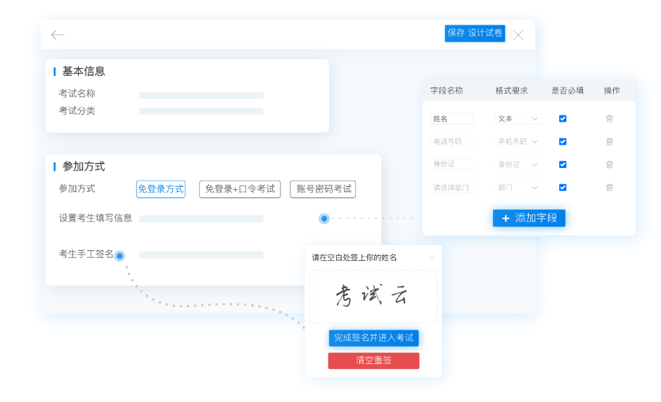 考试负责人在创建招聘考试时,选择了免登录的参加方式,没有自定义添加新的字段信息,只需要应聘者填写考试云默认的姓名字段。除此之外,考试负责人还启用了“考生手工签名”的功能,让应聘者在填写完自己的姓名之后,必须亲手签名才能参加考试、开始答题。