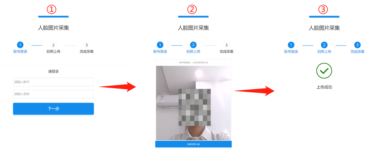 2、考生通过二维码或链接进入人脸采集页面,需要先登录自己已有的考生账号;然后拍照上传人脸头像即可完成人脸采集。