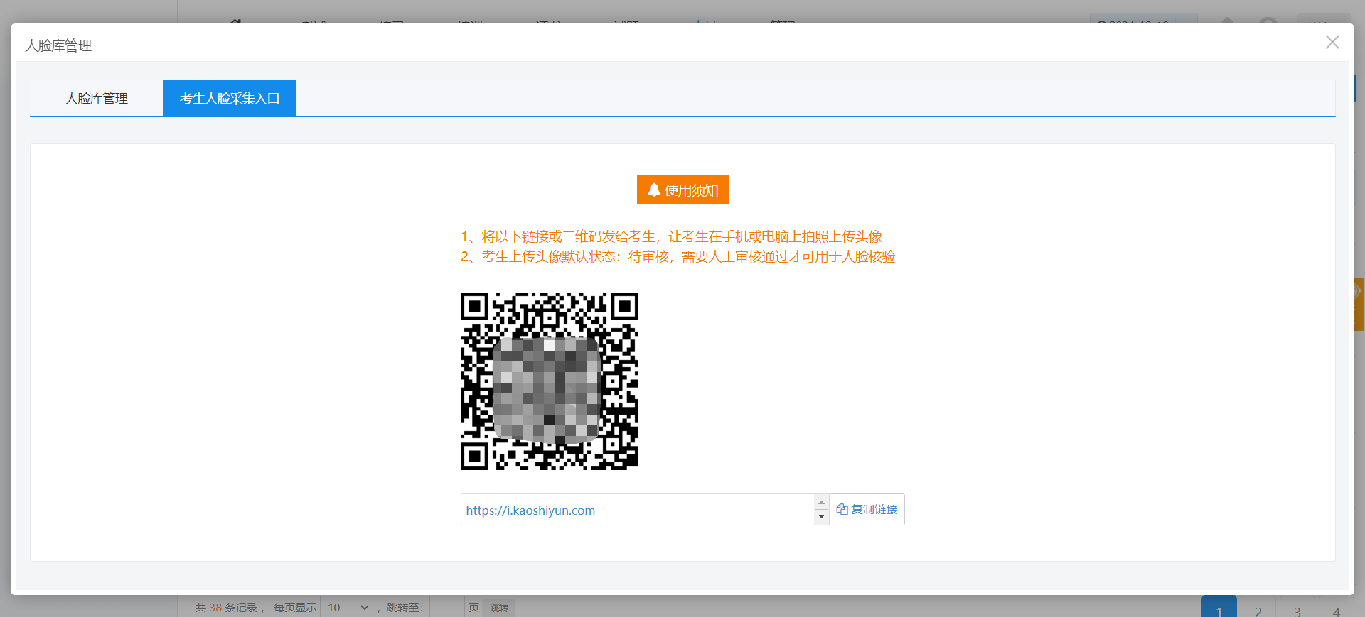 ② 点击“考生人脸采集入口”的按钮,将二维码/链接分享给考生,考生通过手机、电脑拍照上传头像。