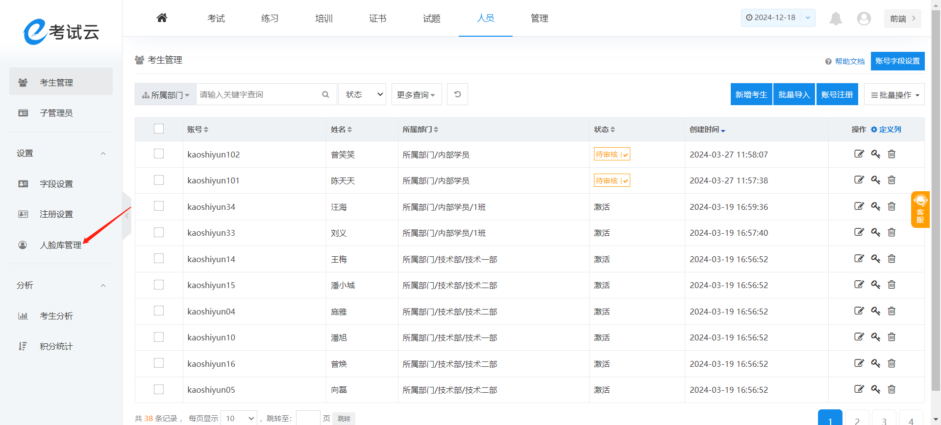 1、在顶部导航栏的“人员”菜单中,点击“人脸库管理”的按钮,考试云有两种上传人脸信息的方式: