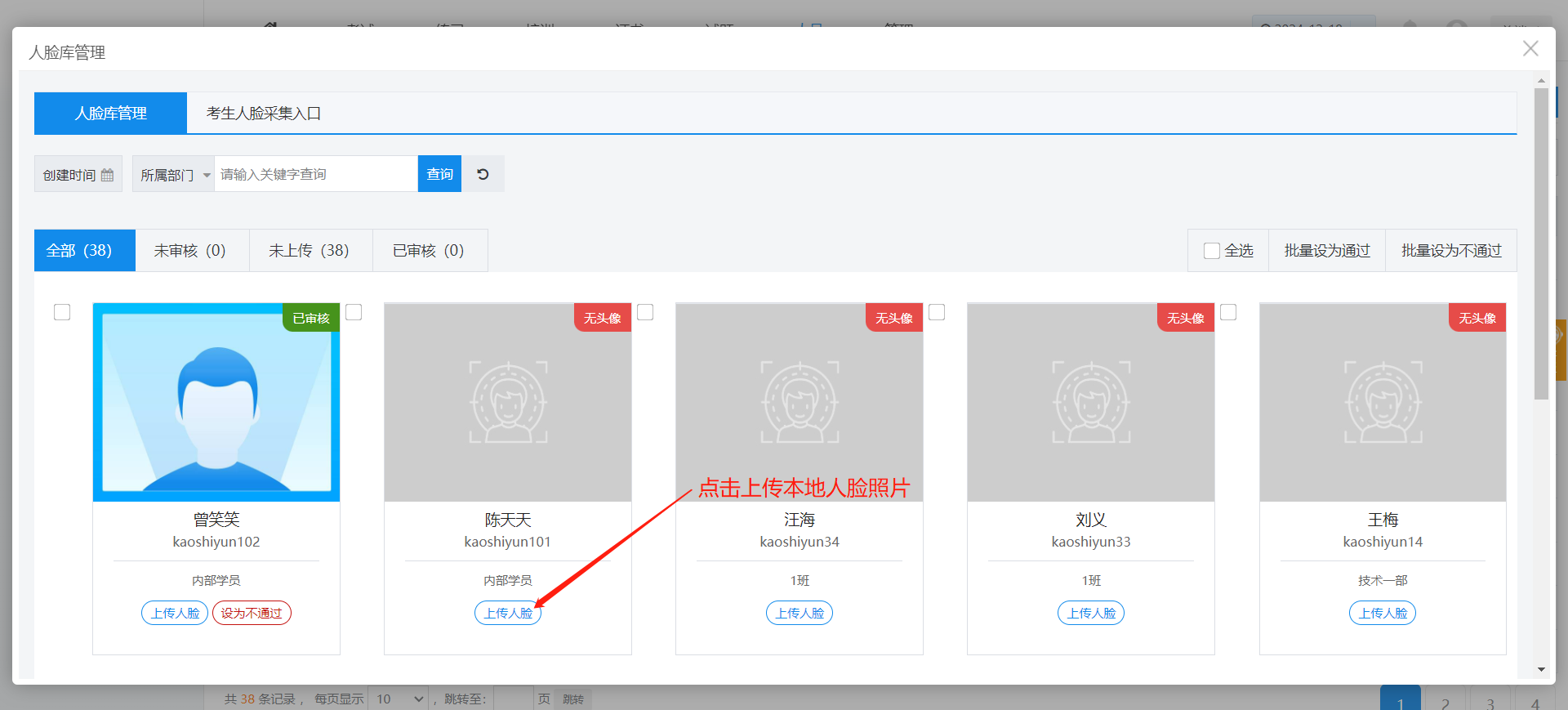 ① 在弹出的“人脸库管理”页面,管理员可提前收集考生人脸照片,点击“上传人脸”按钮,直接上传考生人脸照片。