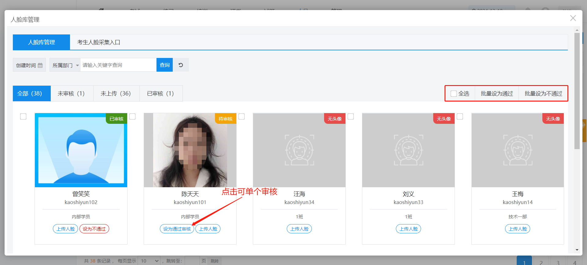 3、管理员在“人脸库管理”中,可对人脸信息进行审核。可点击“设为通过审核”按钮单个审核考生人脸信息;也可先勾选考生人脸信息,再点击“批量设为通过”的按钮,一键审核人脸信息。
