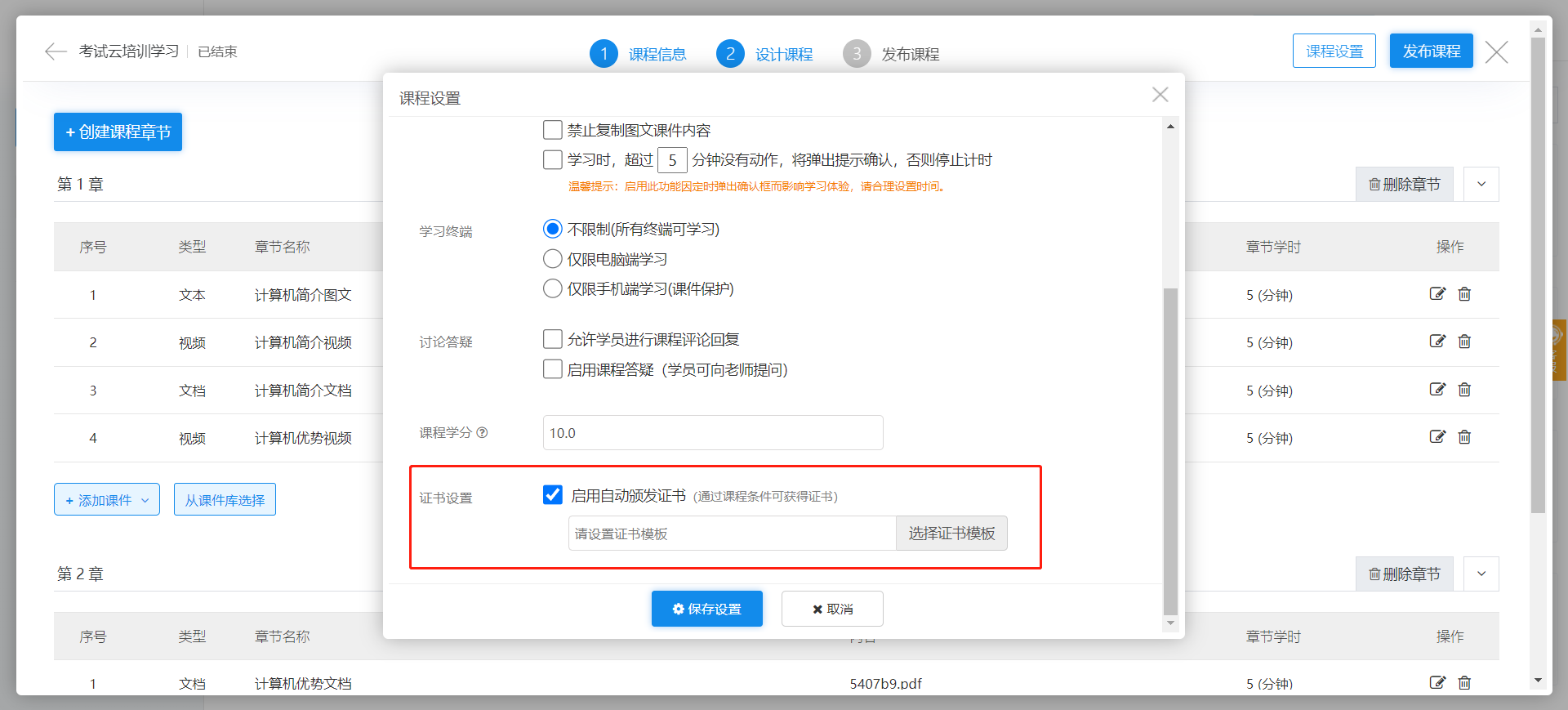 在“培训设置”中,勾选“证书设置”启用自动颁发证书并设置证书颁发的条件。