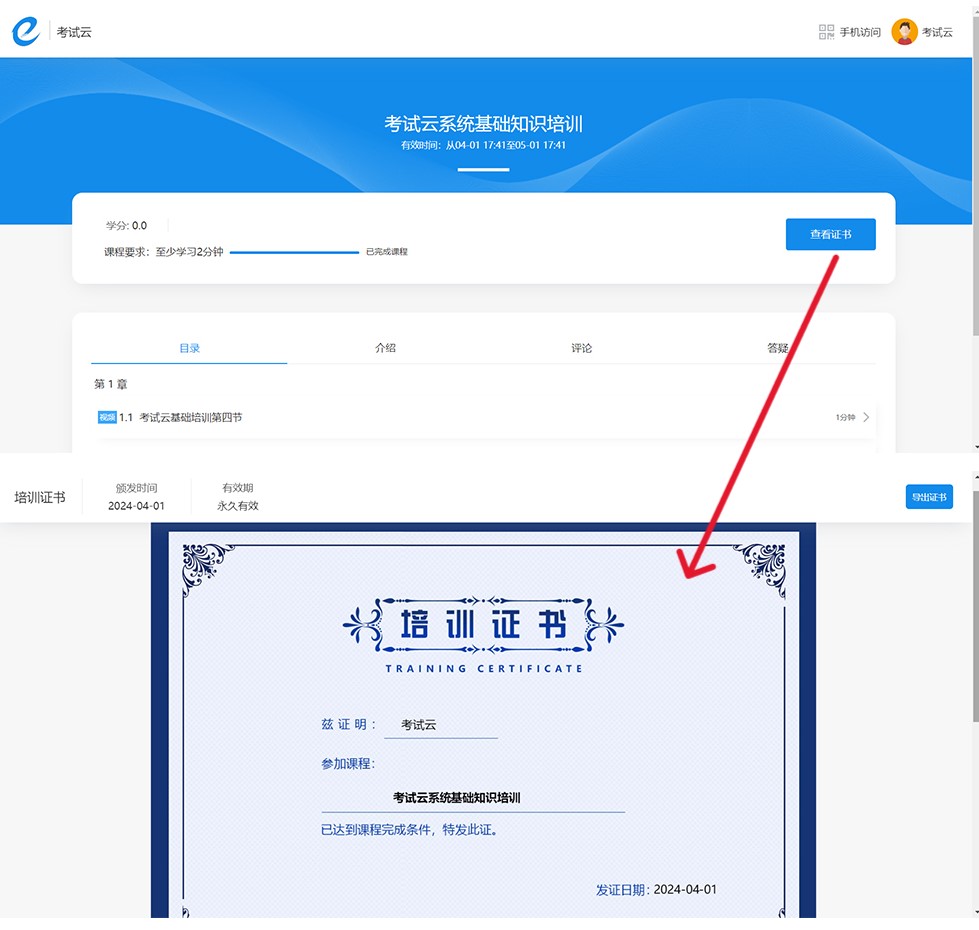 培训证书在学员通过管理员设置的培训完成条件后,即可获得证书。
