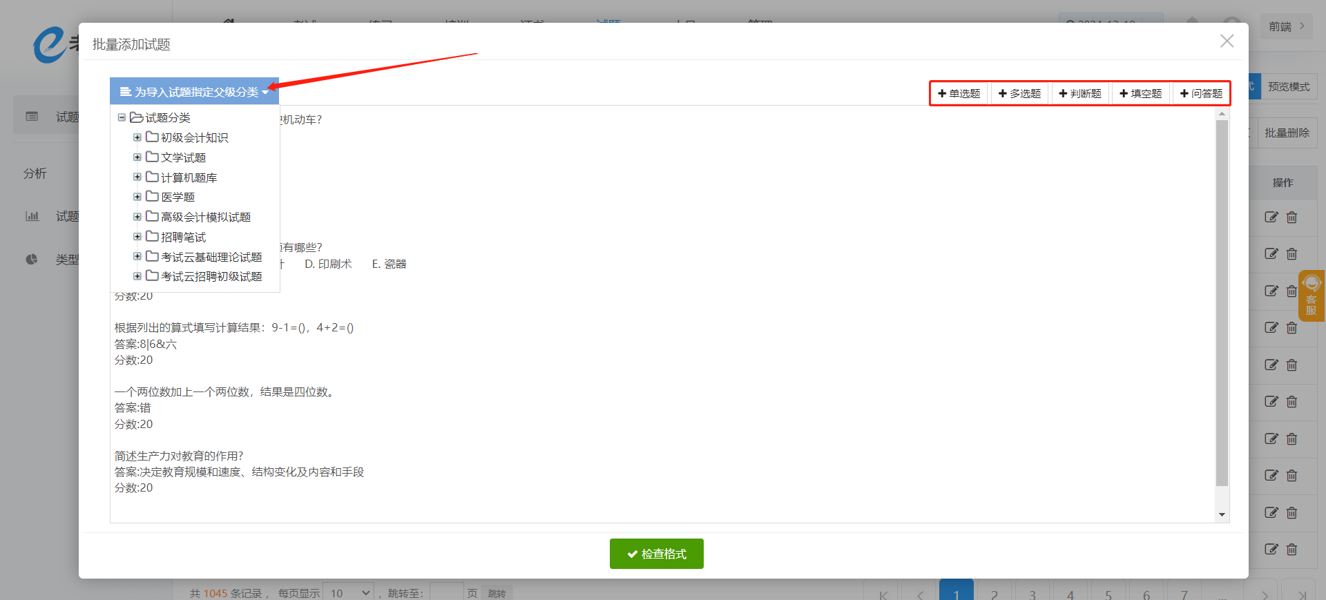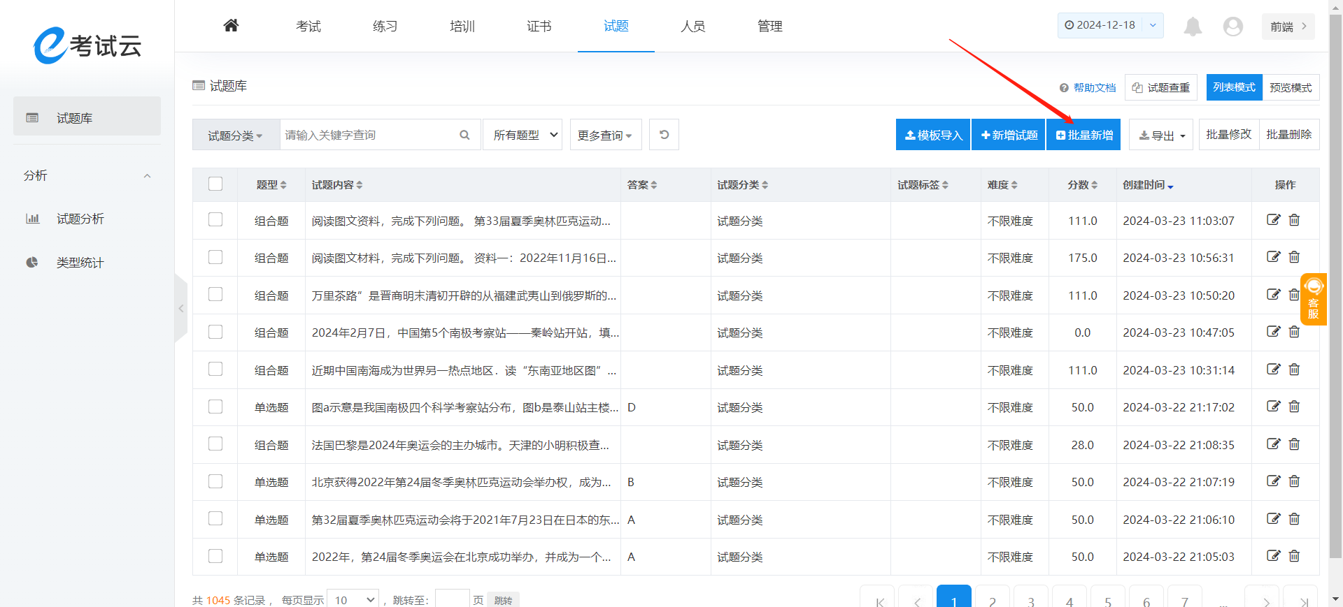 考试云批量新增会自动识别题目题干、试题类型等,只须简单整理即可,具体操作步骤如下: