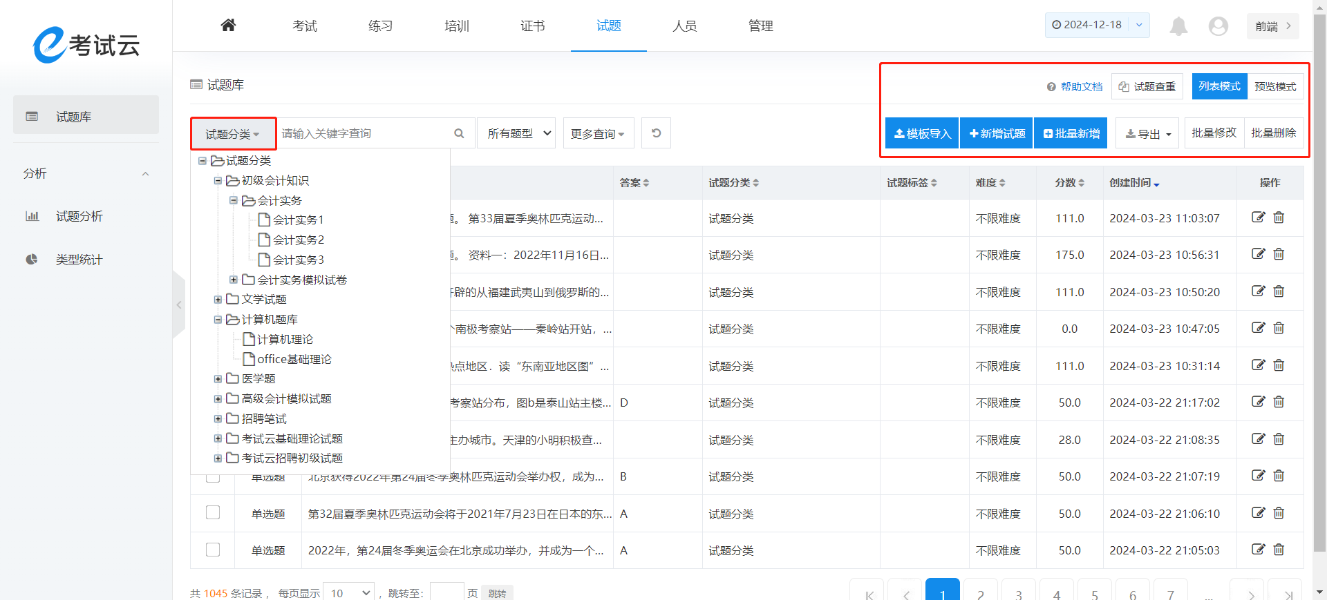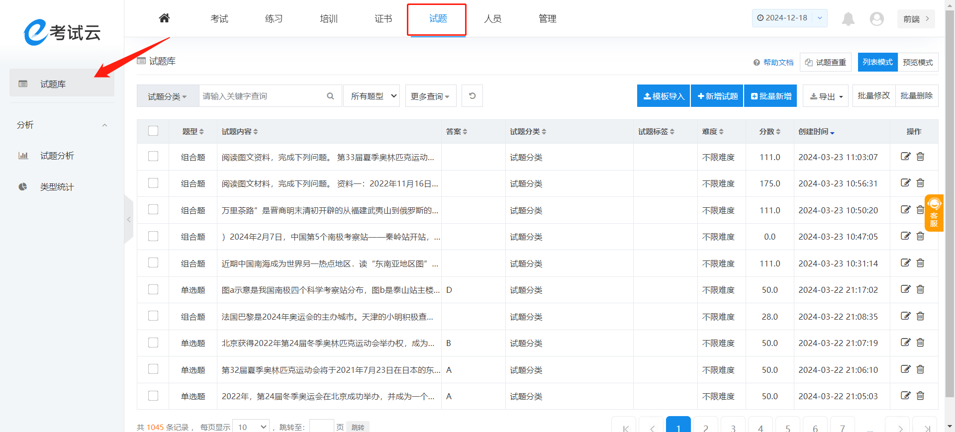 试题管理用于统一管理试题,在顶部菜单打开“试题”,进入试题库,如下图: